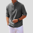 Dieses Oberteil ist locker geschnitten und verfügt über einen kurzen Stehkragen mit halber Knopfleiste. Die Oberfläche zeigt eine sichtbare Struktur, die gleichmäßig verarbeitet ist. Auf der linken Brustseite befindet sich eine aufgesetzte Tasche. Die Ärmel sind leicht gekrempelt und seitlich fixiert. Der Saum ist abgerundet und fällt locker.