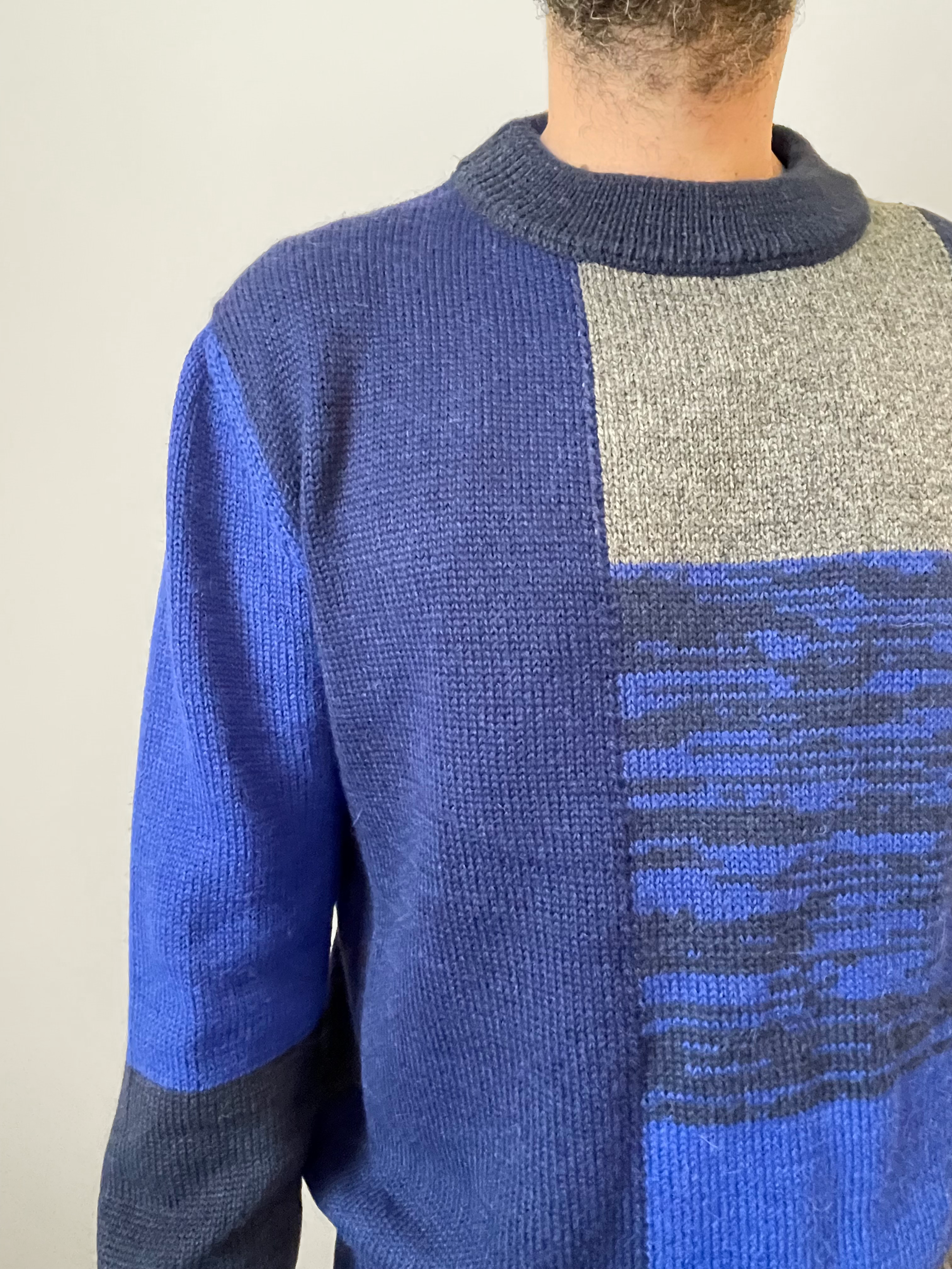 Dieser Pullover ist in einem grob gestrickten Design mit auffälligem Blockmuster gefertigt. Er verfügt über einen klassischen Rundhalsausschnitt sowie gerippte Bündchen an Ärmeln und Saum. Die Passform wirkt locker und gerade geschnitten. Die Oberfläche zeigt eine strukturierte Ausführung mit klar erkennbaren Farbflächen und gleichmäßiger Verarbeitung.