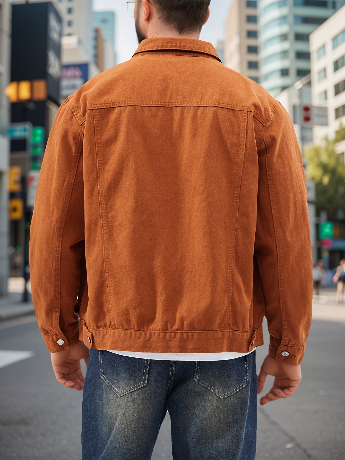 Diese Jacke besitzt eine sichtbare Knopfleiste auf der Vorderseite sowie zwei Brusttaschen mit Klappen und Knopfverschluss. Die Nähte sind betont gesetzt und verlaufen entlang der Schultern, Brust und Rückseite. Der Schnitt ist gerade gehalten, mit klassischem Kragen und langen Ärmeln. Das Material wirkt strukturiert und fest, was zu einem stabilen Gesamteindruck beiträgt.