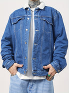 Diese Jeansjacke besteht aus robustem Material mit sichtbarer Struktur und durchgehender Knopfleiste auf der Vorderseite. Sie verfügt über zwei Brusttaschen mit Klappen sowie dezente Nähdetails entlang der Vorder- und Rückseite. Die Passform ist gerade geschnitten, mit klassischem Kragen und langem Arm. Der Stoff wirkt fest verarbeitet und bietet eine klare Silhouette. Die Jacke zeigt sowohl im geschlossenen als auch im offenen Zustand eine gleichmäßige Verarbeitung.